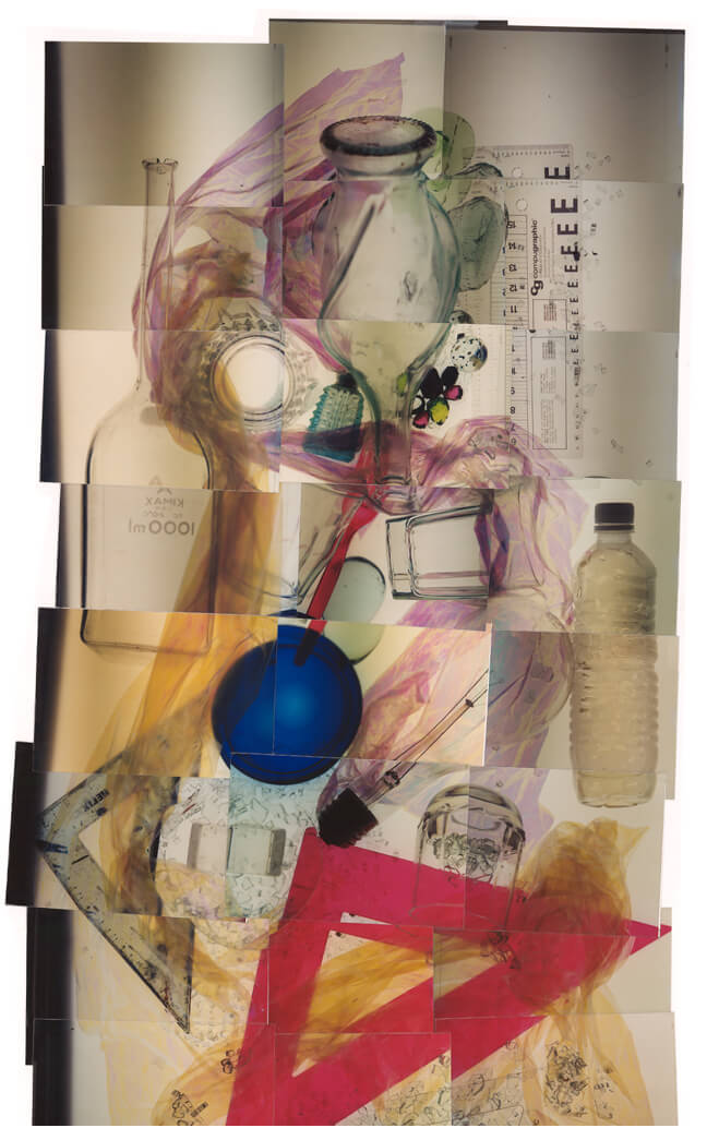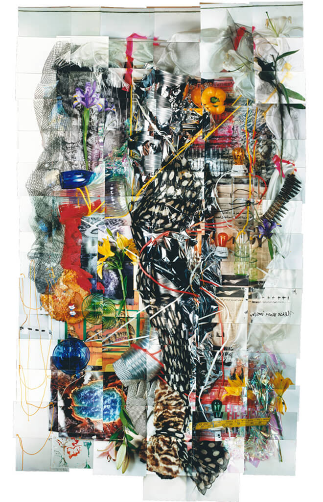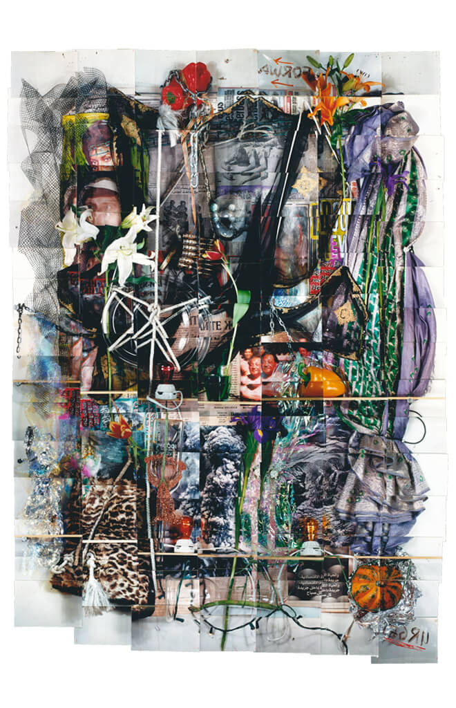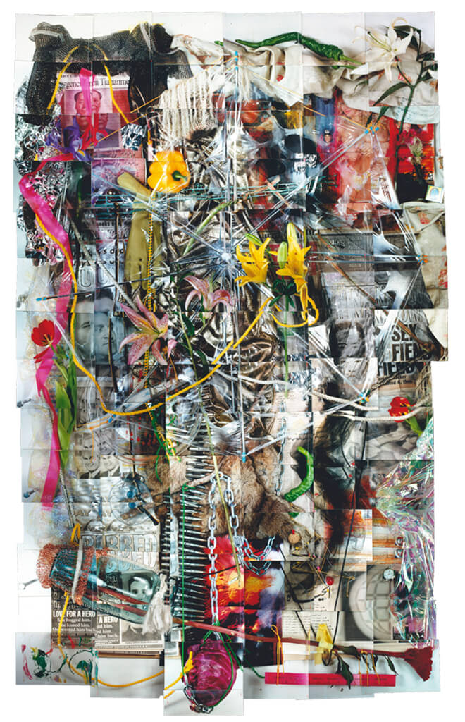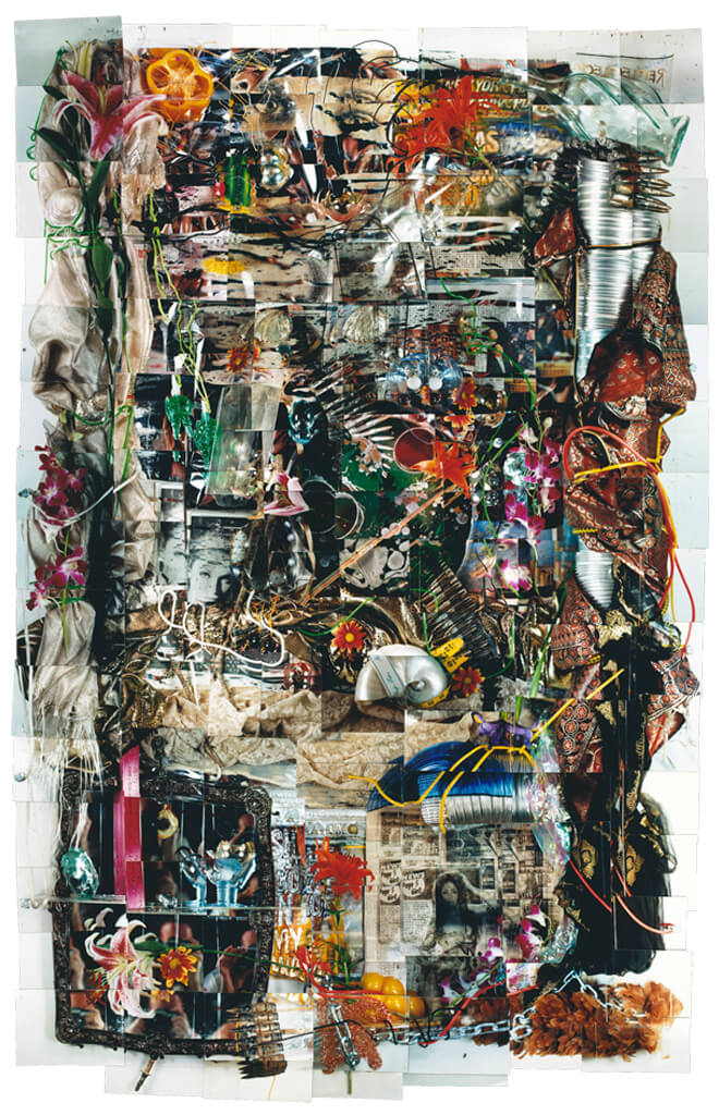 Statement: These photo-constructions are made up of photographs that are the exact size of the responding fragments or details of a whole piece. They are then assembled in order of sequence of their shooting to form a whole record of still life or installation. The size of the still life is equal to the size of their corresponding photo construction because of the use of close-up optics creating a detailed image as if the installation was photographed with a lens the same size as itself yielding a hyper-reality unlike other methods that similarly use one photograph to record on large subject. These elements are placed, stretched and composed as if they were visual symbols in a painting in which the juxtaposition of different materials and organic matter are intended to create a subtle tension in the installation. For example flowers wrapped in barbed wire and readable articles about disaster or violence are placed side by side with fine fabrics and other more delicate materials. These are combined and entwined not only to physically compose but to metaphorically stimulate the final still life. As one will notice in the work the spatial concern is more oriented to the surface rather than to deep panoramic space. Newspaper fragments combine with other more tactile elements to emphasize a readable surface and a linear process of assembling. These pieces metaphorically are like a composite of separate chords and notes that when finally combined resonate as the memory of the collective whole. Essentially this is how we see, taking in details, and assembling them into a coherent whole.